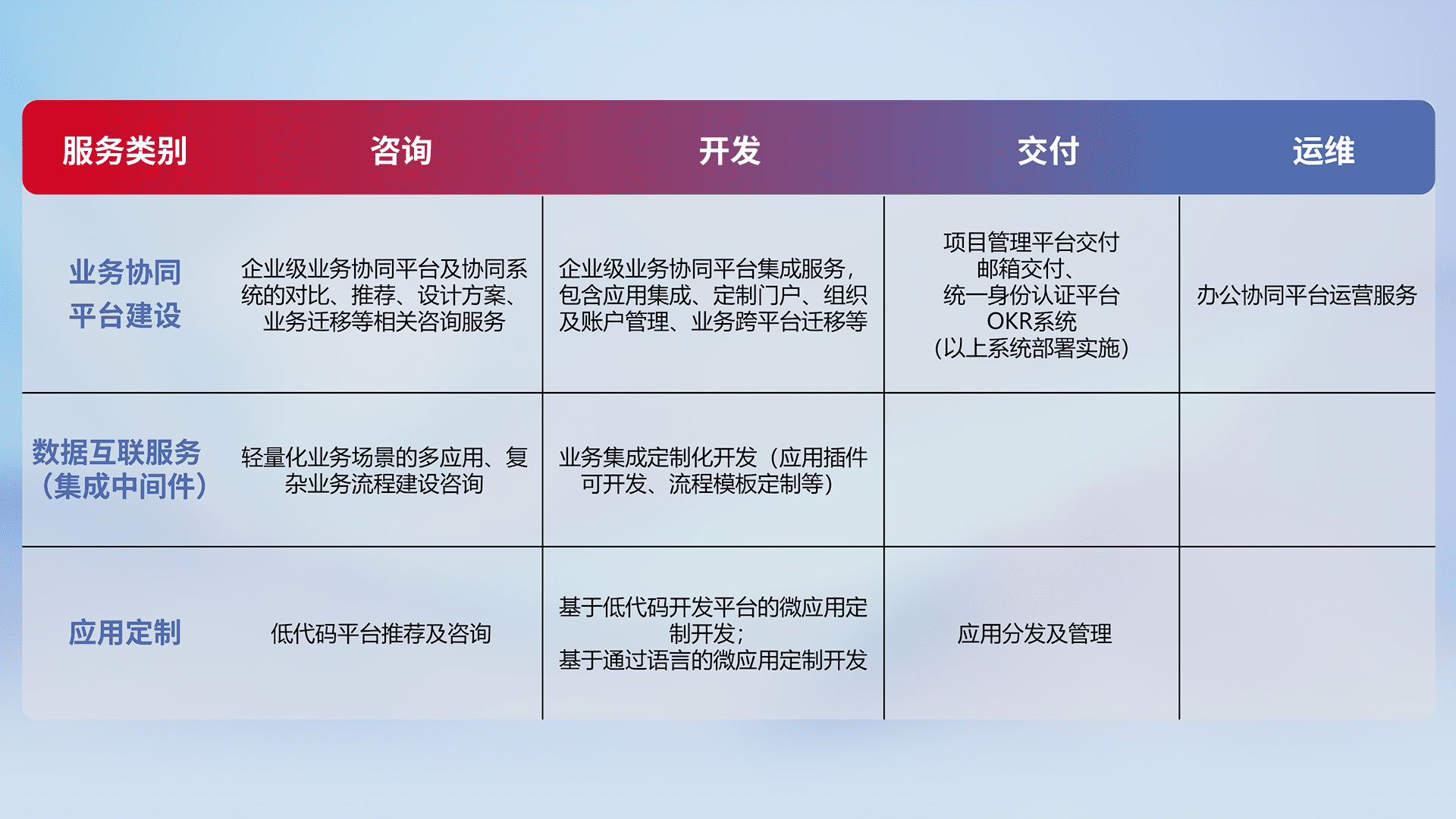 针对钉钉、、、企微、、、IDaas等平台级产品提供产品的规划、、方案、、、交付、、、、定制化开发等服务,,,,实现如统一协同办公、、、、智能客户服务、、混合会议管理、、智能数据查询、、、等业务场景,,,实现数字化转型。。。。