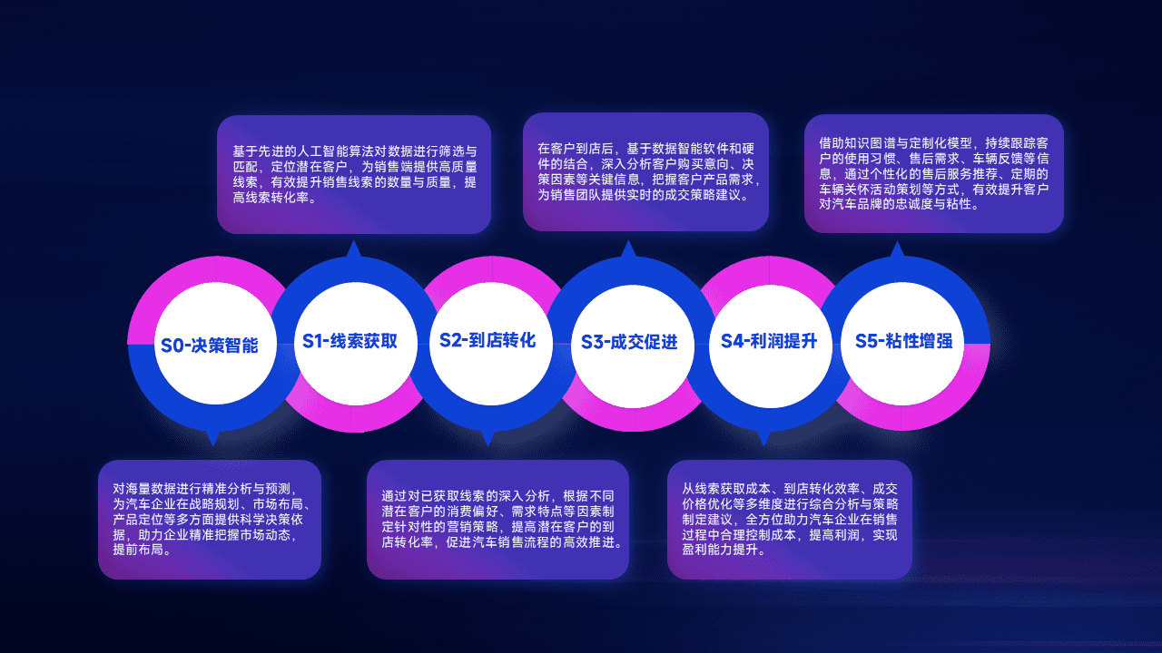 通过拓宽潜在客户来源、、优化线索分配并提高到店转化率,,,,以增强销售效率。。。同时,,,利用线索数据不断优化分析模型,,,有效提升转化率,,,,扩大营销影响力。。。。